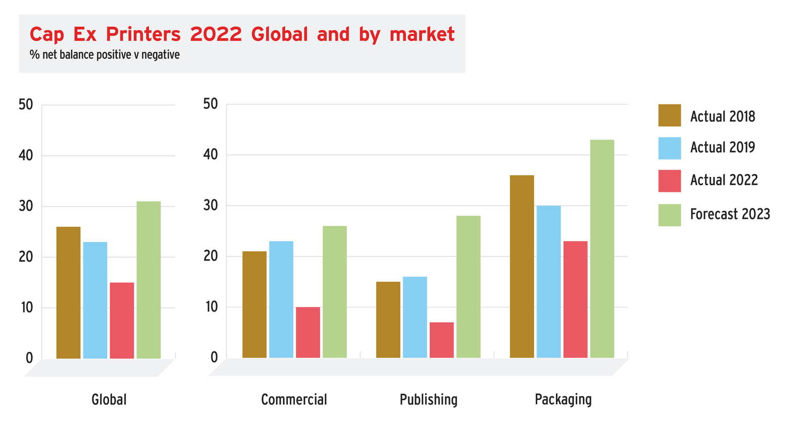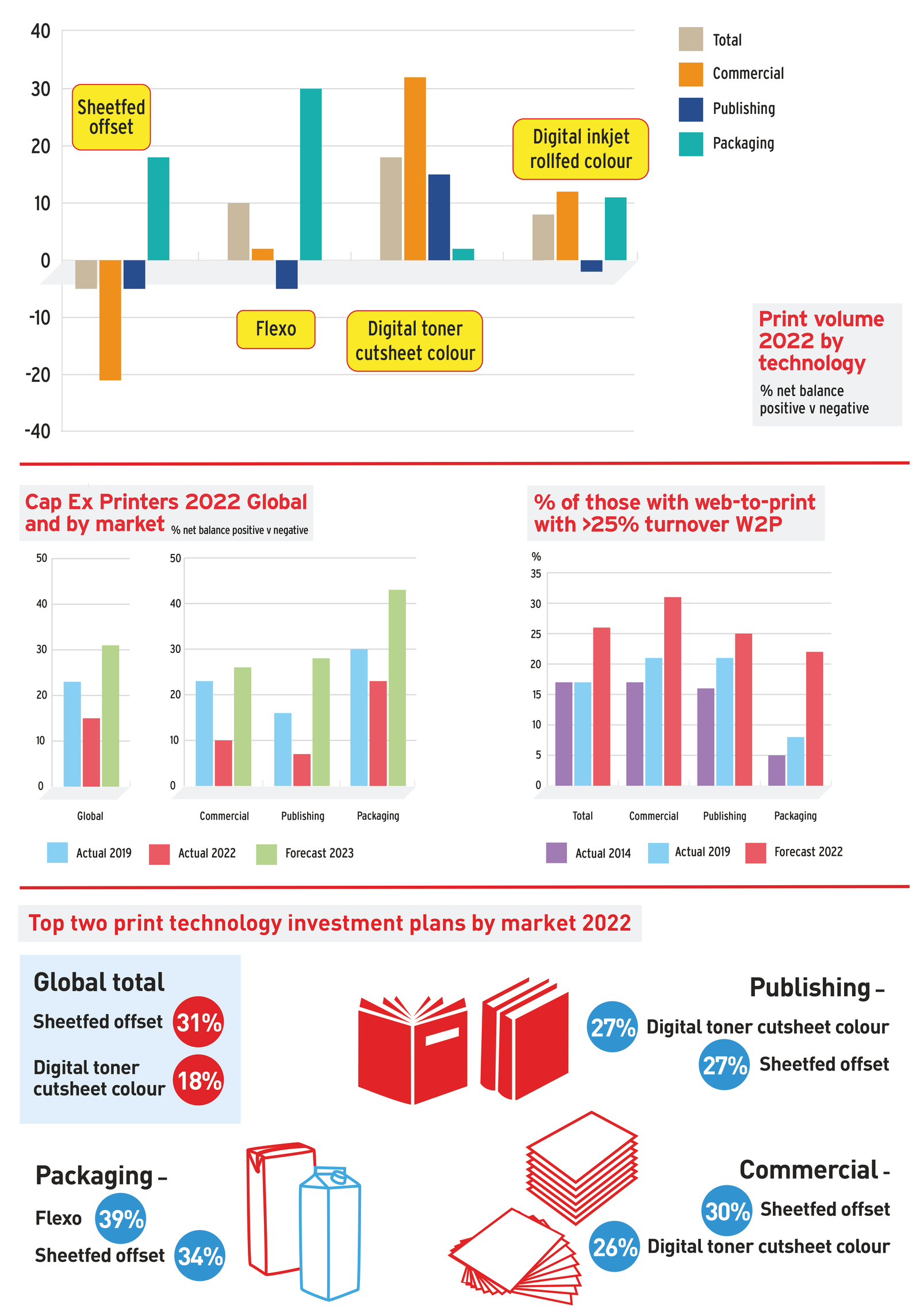As for suppliers, they reported a net positive balance +15% for Cap Ex in 2022 and a net positive of +31% in 2023. Investment forecasts for 2023 were more muted in Commercial and Publishing but strong in Packaging and Functional.