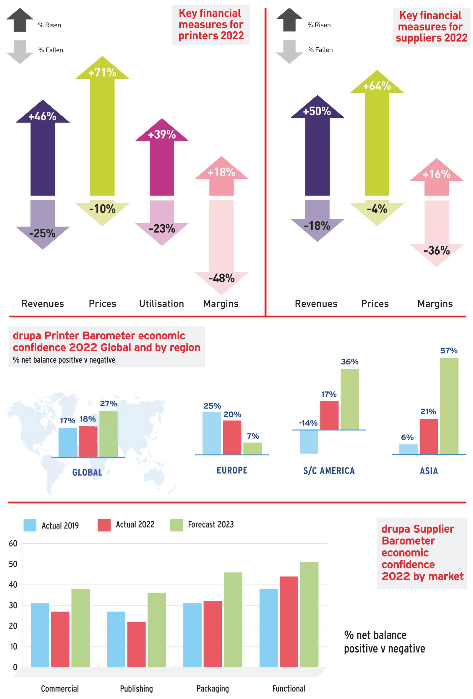 Suppliers were more confident, a global net positive of +34% for 2022 and notably more positive for Europe for 2023. Whilst they were a little more cautious for the Commercial and Publishing markets for 2022 – down 4 or 5% on 2019, they have strong positive forecasts for all market sectors for 2023 (net positive balances for Publishing +36%, Commercial +38%, Packaging +48%, Functional +51%).