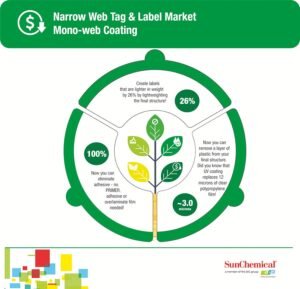 Sun Chemical’s portfolio of monoweb protective coatings, including the SunCure high-resistance, high-durability UV flexography product, as well as solvent- and water-based versions, permitted monoweb films to replace lamination for applications in wraparound labels and flexible packaging—including wrappers and pouches.