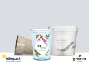 Greiner is developing sustainable solutions such as the Re-Use Coffee Cup, the self-separating K3 r100 and the lightweight IML Bucket. Image: Greiner Packaging. with recycled content, which can withstand temperatures of up to 120°C, making them particularly appealing for dairy products that need to be hot-filled.