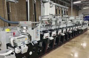 Both presses are fitted with 40” (1000mm) unwind with closed-loop control and electronic web guiding, followed by a Vetaphone corona treater and Teknek web cleaner. To handle filmic substrates the presses have chilled impression rolls and are fitted with an overhead rail system for mounting turn bars, cold foil, and lamination capabilities. Each of the 10 print stations has recirculating hot air drying as well as full UV curing.