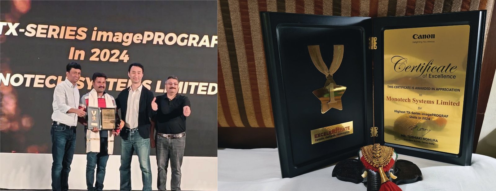 Monotech Systems Limited’s achievement of the ‘Highest TX-Series imagePROGRAF Units in 2024’ award is cementing the company’s position as the top Canon Large Format Printers dealer in India. The award was presented by Toshiaki Nomura, President & CEO, Canon India Pvt Ltd, to Sudhakar Lingappan, DGM, Monotech Systems Limited, in a ceremony that highlighted Monotech Systems Limited’s contribution to revolutionising large-format printing in the country.