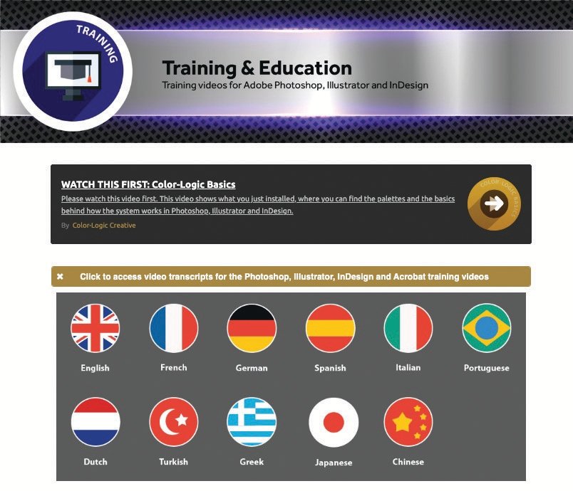 Color-Logic Training Videos: The comprehensive Color-Logic training videos, created in collaboration with Adobe Creative Cloud, feature transcripts in English and ten additional languages: French, German, Spanish, Italian, Portuguese, Dutch, Turkish, Greek, Japanese, and Chinese.