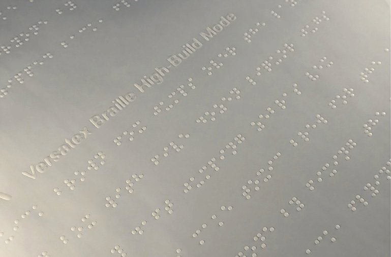 The Versatex printbar solves the challenge of producing braille that is both highly readable and fast to print, offering two dedicated modes tailored to different production needs. In High-Build mode, it delivers dot heights of 200 µm, rated most comfortable by blind readers, at up to19 m/min, ensuring crisp, well-shaped cells with precise spacing for optimal fingertip recognition.