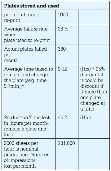 Plates stored and used per month under re-print 1000 Average failure rate when plate used to re-print 38 % Actual plates failed per month 380 Average time taken to remake and change the plate (avg. time 9.7min.)* 0.12 (Hrs) * 25% discount if it could be discount if it more than one plate changed at a time Production Time lost in hours per month- remake a plate and load 46.2 (Hrs) 5000 sheets per hour is nominal production. Number of impressions lost per month 231,000