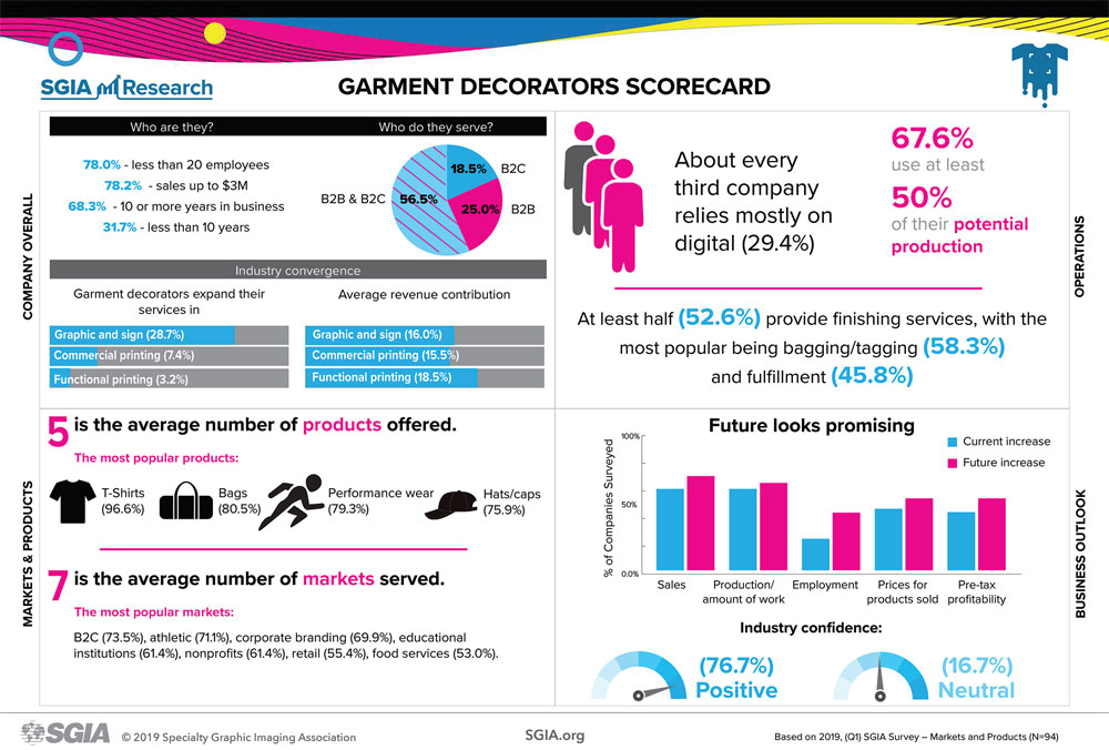 According to the SGIA’s Industry Benchmarking Reports, 78% of garment decorators have less than 20 employees, 78.2% have sales up to $3 million and 68.3% have 10 or more years in business (31.7% — less than 10 years old). Talking about the business, they cater to B2C — 73.5%, Athletic — 71.1%, Corporate Branding — 69.9%, Educational Institutions — 61.4%, Non-profits — 61.4%, Retail — 55.4% and Food Services — 53.0%. The most popular products include T-Shirts (96.6%), Bags (80.5%), Performance wear (79.3%) and Hats/caps (75.9%). Mass customisation, increased personalisation, and environmental benefits are fueling the growth of short-run print on demand.
