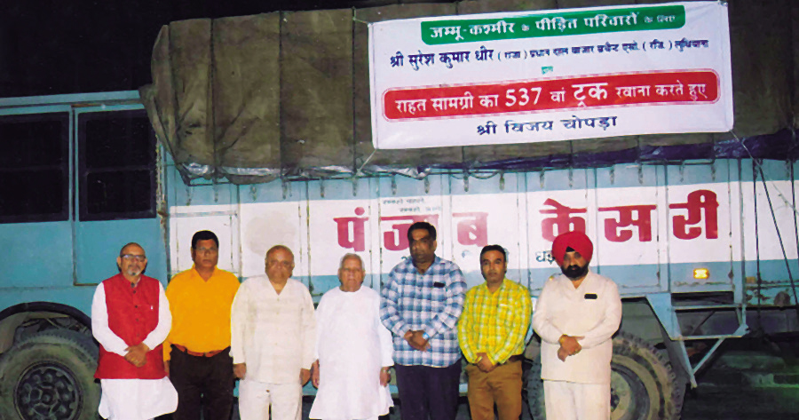 Punjab Kesari Group recently flagged off the 537th truck of relief material for distribution to the migrants of border villages of Mehdher Distt Poonch, J&K. Punjab Kesari has been sending trucks of relief material to the migrants of Jammu & Kashmir since 1999 and so far 536 trucks carrying such items have been dispatched for the migrants.