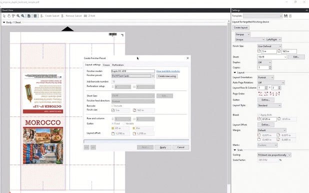 With this advanced finishing integration, there is no longer a need to set up a finishing layout on the Duplo controller and import it into Fiery Impose. Fiery Impose now has built-in knowledge of the Duplo DC-618 configuration options and constraints. Customers can quickly and confidently create a custom imposition layout through a setup wizard that provides a step-by-step process with interactive, visual feedback showing the addition of cut, crease and perforation settings – all within the displayed constraints of the finisher. The operator will finish the printed job simply by feeding the sheets into the DC-618 without any additional programming setup on the Duplo controller. This workflow accelerates production turnaround time while eliminating operator touchpoints and errors from incompatible layouts.